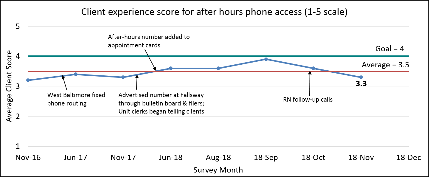 Goal: By December 2018, the organization will improve its client satisfaction with reaching a provider when the clinic is closed to 4.0 on a 1-5 scale (June 2018 score = 3.6)