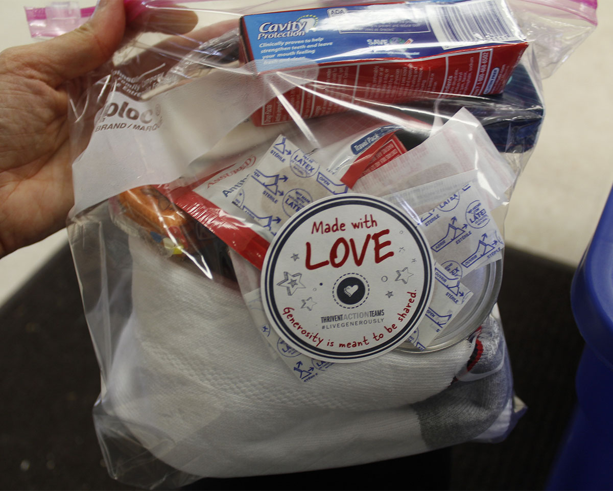 Board member Eric Wendler has been making Grace Bags, ziplock bags full of the basics people need, with his church for more than 5 years. "We hope that the resources in these bags will give each person energy, show them that we care and acknowledge that they are important," he says. "Maybe a little boost like that will make a difference."