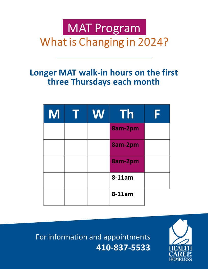 - Longer MAT walk-in hours on the first three Thursdays a month (8 am-2pm)