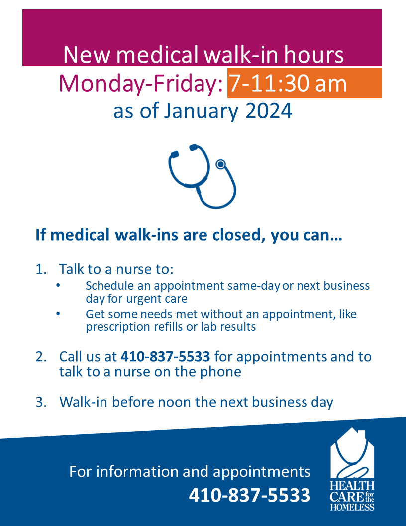 - Medical walk-in hours are now Monday-Friday (7-11:30 am), with more 24-hour appointment slots