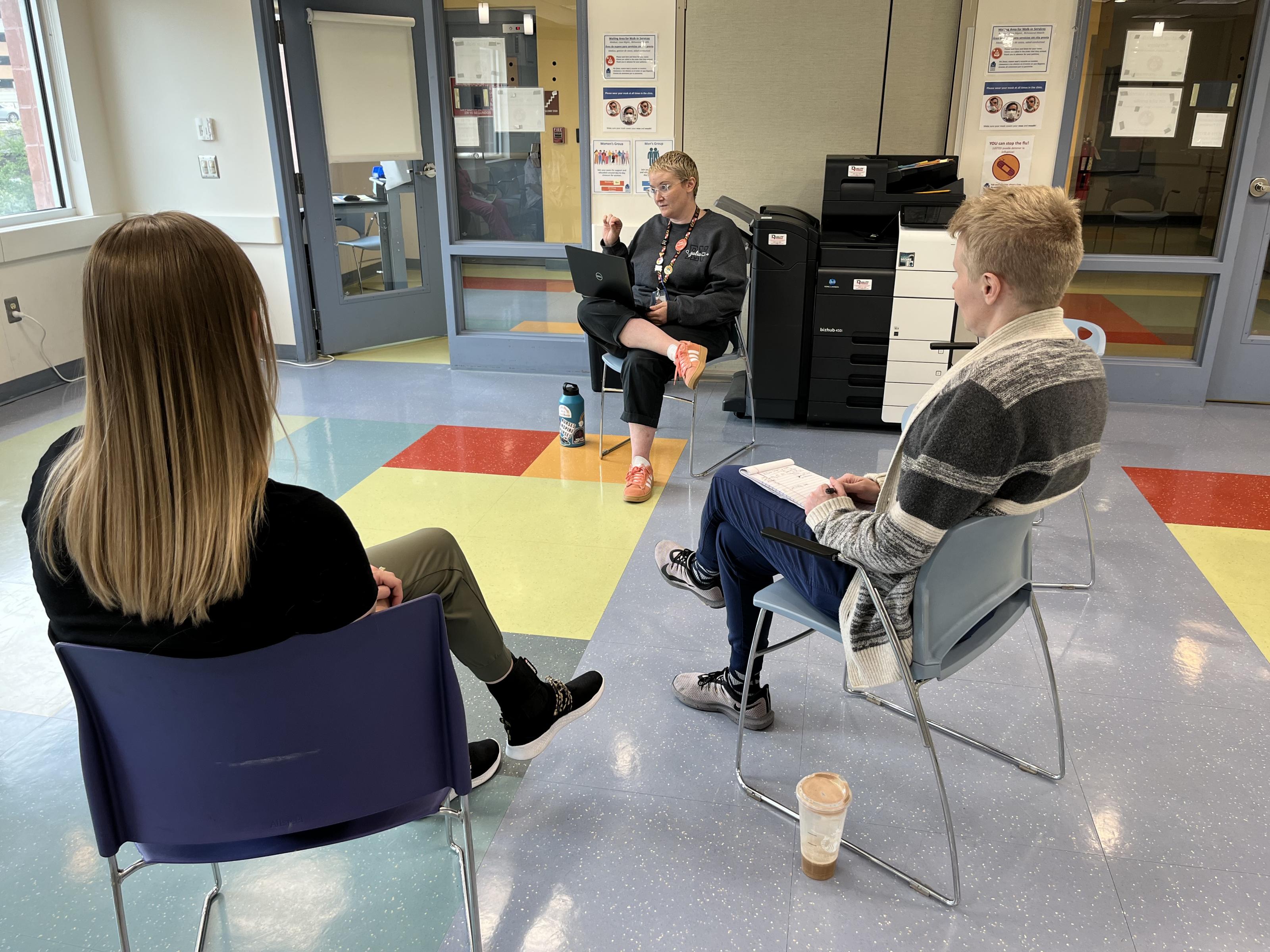 1:30 PM: On Mondays and Tuesdays, Kayla works in triage—seeing individuals and families who walk-in for care without appointments. She goes to a clinic meeting with six other triage nurses to talk through what’s going well, to identify recent trends and problem solve any complaints.
