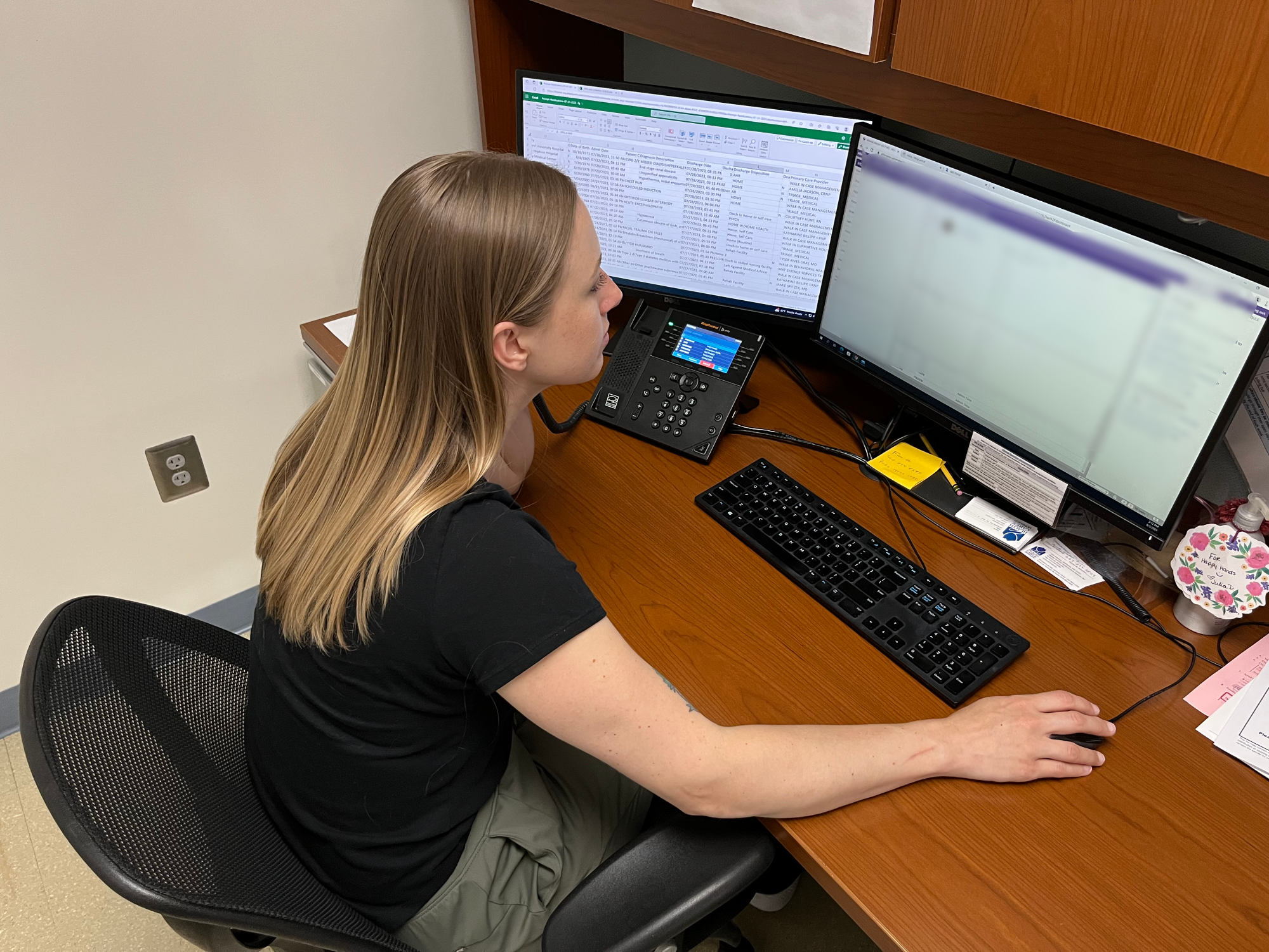 2:30 PM: Back at the desk, she scans through the hospital data again. Kayla reaches out to around 20 clients on the list each day. “I like digging through the database and trying to piece together a client's health story so they get the care they need.” She calls the interpreter line and asks them to initiate a call with a Spanish-speaking client who had his appendix removed a few weeks ago.