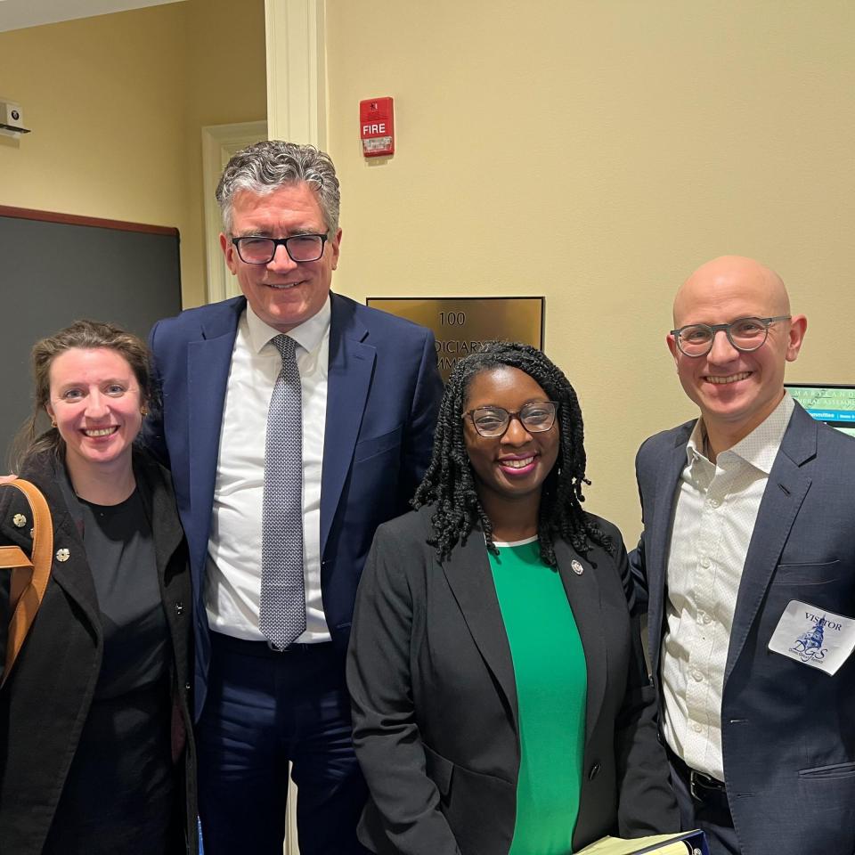 Pictured above: NHLC Sr. Policy Director Eric Tars (right) with Delegate Bernice Mireku-North with Health Care for the Homeless President & CEO Kevin Lindamood and Policy Director Joanna Diamond after testifying in favor of HB487.
