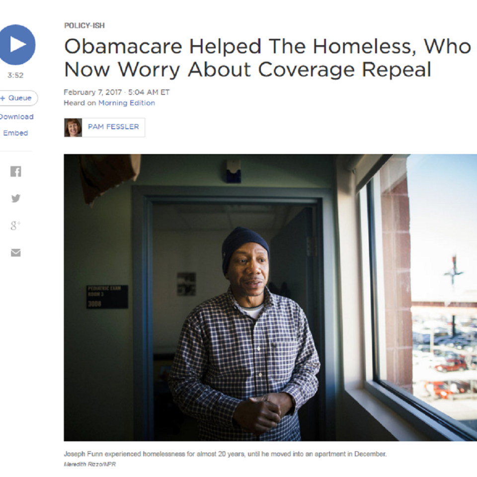 In this National Public Radio (NPR) segment with Pam Fessler, our own Kevin Lindamood and Barbara DiPietro remind listeners of the importance of maintaining Medicaid expansion here in Maryland, which helped increase health care coverage for our clients from 30% to 90%. Hitting even closer to home, Health Care for the Homeless client Joseph Funn sheds light on his own experience obtaining coverage, and what health care and housing have meant to him—and what they do and could mean for so many others.