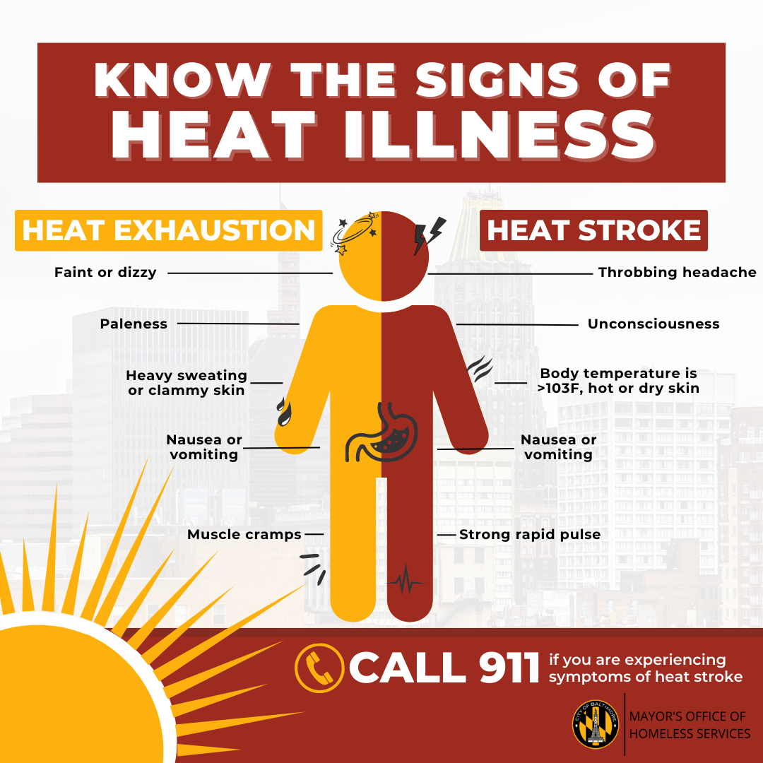 - Check Code Red status online or call 311 to see if Baltimore City is opening additional cooling centers (see the Baltimore City Health Department guide)